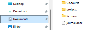 On a Windows operating system, usually, every user has their own “space” in which downloads, documents, images etc. are stored (?@fig-documents). When you now open a directory (e.g. the Rcourse directory Figure 2), you actually navigate through your file system - although Microsoft does a really good to hide the file path from you. If you click in the top bar, you can get the path. Note that in example Figure 2 the system language is German, but the actual path is in English. And further, Windows file paths use the backslash \ instead of the forward slash / to delineate directories. So, if you copy this path and want to use it in the R script, you have to change the backslashes to forward slashes.