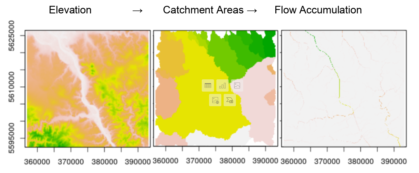 - e.g. tools in the field of hydrology and morphometry not common in R but in SAGA